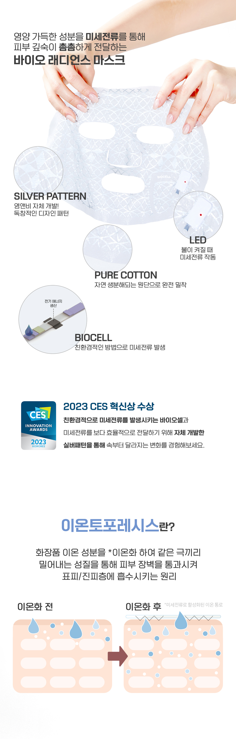 이 과정은 ‘이온토포레시스’라고 하며, 본래 피부를 통해 약물을 전달하는 의료 기술로 사용되다가, 현재는 화장품의 유효 성분 흡수를 돕기 위해 스킨케어에 활용되고 있습니다. 미세 전류가 영양 성분을 이온화하면, 이온 간의 전하 반발력을 이용해 피부 장벽을 넘어 진피 깊숙이까지 성분이 전달됩니다.